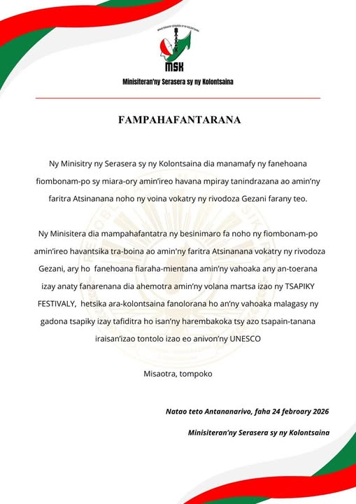 Le Ministre de la Communication et de la Culture, joue un rôle essentiel dans la régulation et la promotion des secteurs de la communication et de la culture à Madagascar. Il œuvre pour garantir l'accès à l'information tout en valorisant la richesse culturelle malgache sur les scènes nationale et internationale. Missions Principales: 1-Promotion de la Communication : Garantir l'accès libre à l'information, promouvoir la liberté d'expression et soutenir le développement des médias. Réguler les différentes plateformes de communication, y compris la presse écrite et en ligne, la télévision, et les réseaux sociaux. 2-Soutien à la Culture : Protéger et valoriser le patrimoine culturel malgache. Promouvoir des initiatives culturelles afin de renforcer l'identité nationale et la cohésion sociale.