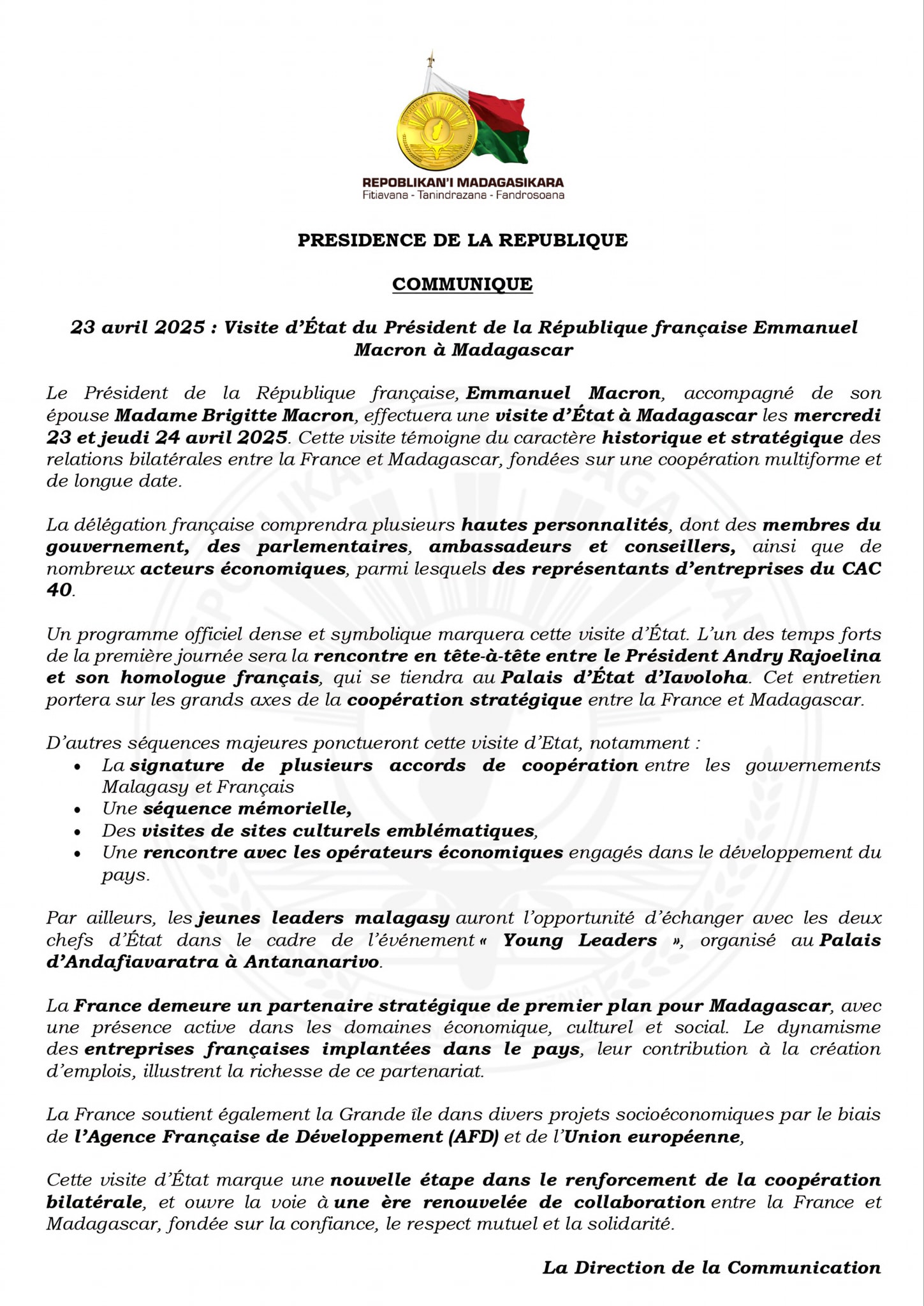 FANAMBARANA MOMBA NY FITSIDIHANA ARA-PANJAKANA HO TANTERAHIN' NY FILOHA FRANTSAY EMMANUEL MACRON ETO MADAGASIKARA NY 23 SY 24 APRILY 2025