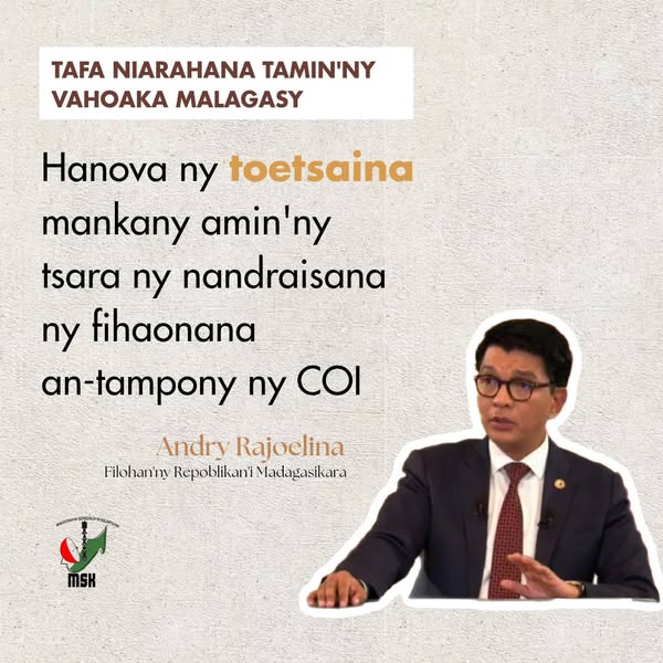 Lohahevitra maromaro no noresahin'ny Filoha Andry Rajoelina tao anatin'ny fandaharana manokana nitafana tamin'ny vahoaka Malagasy.Teo ny fandraisana ny fihaonana an-tampon'ny COI, ny fitsidihana ara-panjakana nataon'ny filoha Frantsay Emmanuel Macron sy ireo tombony azo tao anatin'izany. Fa teo ihany koa ireo lohahevitra nafapana tato ato, toy ny resaka Iles Eparses, ny raharaha Base Toliara, ny fahalalahan'ny asa fanaovan-gazety sy ny maro hafa.Ireto atolotra anao eto ambany ireto ary ny rohy na ny lien ahafahanao mijery tsirairay izany.1- FILOHA Andry Rajoelina : NANOVA TOETSAINA MAKANY AMIN'NY TSARA NY NANDRAISANA NY FIHAONANA AN-TAMPON'NY COI.Lien: https://www.facebook.com/share/v/19ugm4TCNe/2- FILOHA ANDRY RAJOELINA: HAMORAINA NY FIVEZIVEZENA MANKANY LA REUNIONLien: https://www.facebook.com/share/v/12LsEoAjGhi/3- FIHAONANA AN-TAMPON'NY COI : HAHAZO TOMBONY MANOKANA IREO TANTSAHALien: https://www.facebook.com/share/v/1AXXKmFwMW/4- FITSIDIHANA ARA-PANJAKANA NATAON'NY FILOHA FRANTSAY: Maro ireo fifanarahana natao, anisan'izany ny fanarenana ny fitaterana an-dalamby eto Madagasikara Lien: https://www.facebook.com/share/v/16WiKqkGQK/5- ILES EPARSES : HIDINA MIVANTANA HIJERY IREO NOSY NY FILOHA ANDRY RAJOELINA, TSY MAINTSY HISY NY VAHAOLANA MAHARITRA MOMBA AZY IREO Lien: https://www.facebook.com/share/v/16Z3fUjgsX/6- FAHALALAHAN'NY ASA FANAOVAN-GAZETY: MALALAKA NY FANEHOAN-KEVITRA ETO MADAGASIKARA, TOKONY HO MATIHANINA HATRANY ANEFA AMIN'NY ASA Lien: https://www.facebook.com/share/v/1ZxcnrX5Rm/7- ORINASA BASE TOLIARA: HITONDRA FAMPANDROSOANA HO AN'I MADAGASIKARA MANONTOLO HOY NY FILOHA ANDRY RAJOELINALien: https://www.facebook.com/share/v/15MYZQebCB/TVMRadio Madagasikara RNM 99.2 MHz Dépêche Informative Taratra Tefibika sombiny tamin'ireo lohahevitra #MSK