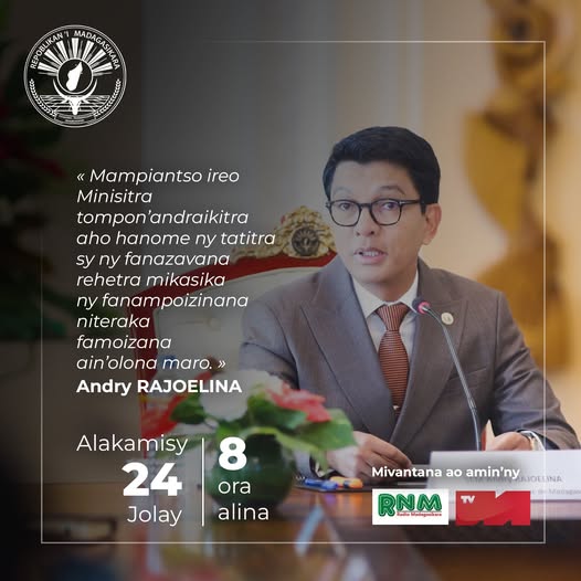Efa nataoko laharam-pahamehana hatrizay fa ny marina hatrany no ho lazaina anareo vahoaka Malagasy.Koa manoloana ny raharaha mikasika ny fanapoizinana niteraka famoizana ain’olona maro dia mampiantso ireo Minisitra tompon’andraikitra aho ao amin'ny Lapam-pajakana ao Iavoloha, ka hanome ny tatitra sy fanazavana rehetra ho antsika izy ireo. Harahinao mivantana ao amin'ny haino amanjery TVM sy RNM izany ny Alakamisy 24 jolay amin'ny 8 ora alina, mba tsy ho tompon-trano mihono ny Malagasy, indrindra ireo manana havana maty sy mbola miatrika fitsaboana.