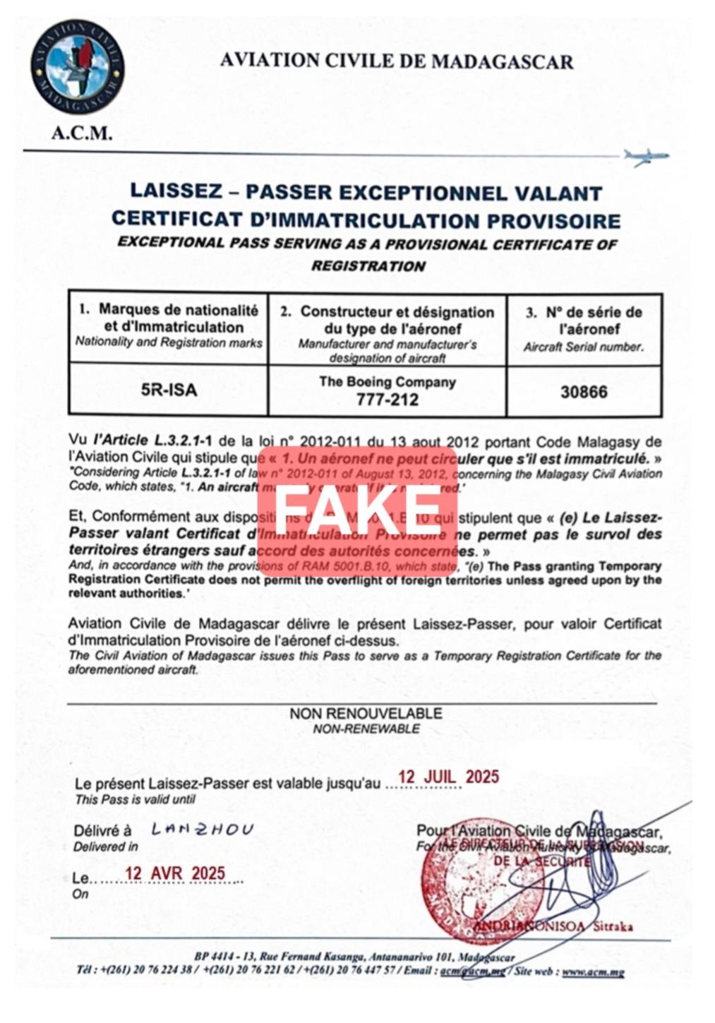 L’ Aviation Civile de Madagascar - ACM dénonce la FALSIFICATION de documents par la société UDAAN Aviation concernant cinq aéronefs provisoirement immatriculés à Madagascar. Des démarches judiciaires sont en cours.L’ACM réaffirme son rôle de garant de la légalité et du respect des normes internationales dans la gestion du registre malagasy. Lire le communiqué complet ci-dessous