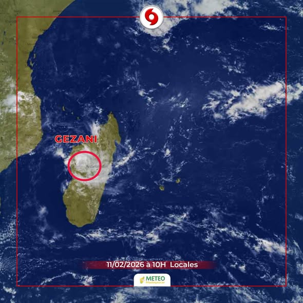10 ora marainaTamin’ny 09 ora maraina teo dia tao amin’ny Kaominina Kiranomena, distrikan’i Fenoarivobe no nisy ny foiben’i GEZANI. Nihena hatrany ny heriny. 45 km/ora ny rivotra miaraka aminy, izay arahina tafiotra 60 km/ora indraindray. Nikisaka niakandrefana somary atsimo andrefana izy ka nahafaka 26 km/ora. Vinavinaina hivoaka any amin’ny lakandranon’i Mozambika, eo anelanelan’ny Maintirano sy Morondava izy anio hariva na ny alina. .Mbola hitohy ny orana miatoato amina faritra maro ary mbola mety handrivotra ny andro amin’ny ankapobeny. Azo ambara kosa nefa fa efa nihena ny hambana mivantana. Noho izany dia miova toy izao ny filazana loza mikasika ny rivodoza.❗❗Miova toy izao ny filazana loza mikasika ny rivodoza :Fahamailoana miloko manga : Analanjirofo, Atsinanana, Alaotra Mangoro, Analamanga, Betsiboka, Bongolava, Itasy, Vakinankaratra, Melaky ary Menabe.Iangaviana ny mpampiasa ranomasina eo anelanelan’i Besalampy sy Morombe mba tsy hiandriaka satria mikorontana ny toetry ny andro. Entanina ny rehetra mba hanaraka hatrany ny toromarika omen’ny manam-pahefana isan-tokony.Météo MadagascarFoibe Famantarana ny toetry ny andro